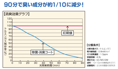 蛍光灯下※において様々な有臭、有毒ガスの分解を確認。