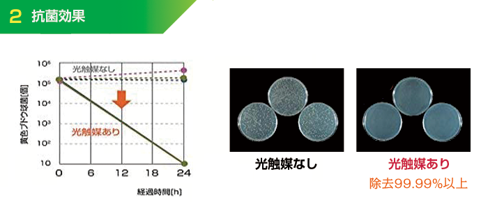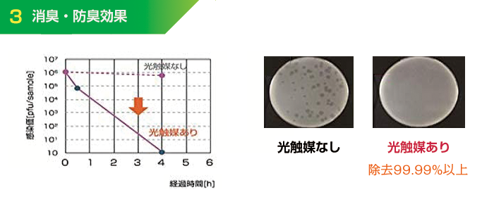 光触媒量10g/m2 除去率99.999%以上と高い抗ウィルス性を示した。※蛍光灯1000lx(UVカットフィルム使用 380nm以下をカット)