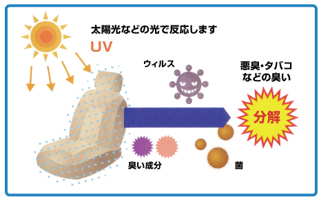 カーコンルームクリニックの「除菌・消臭コート」は太陽光などの光で酸化作用を起こし、 空気中のウィルス・菌やタバコなどの臭いを分解し、除菌、抗菌、消臭します